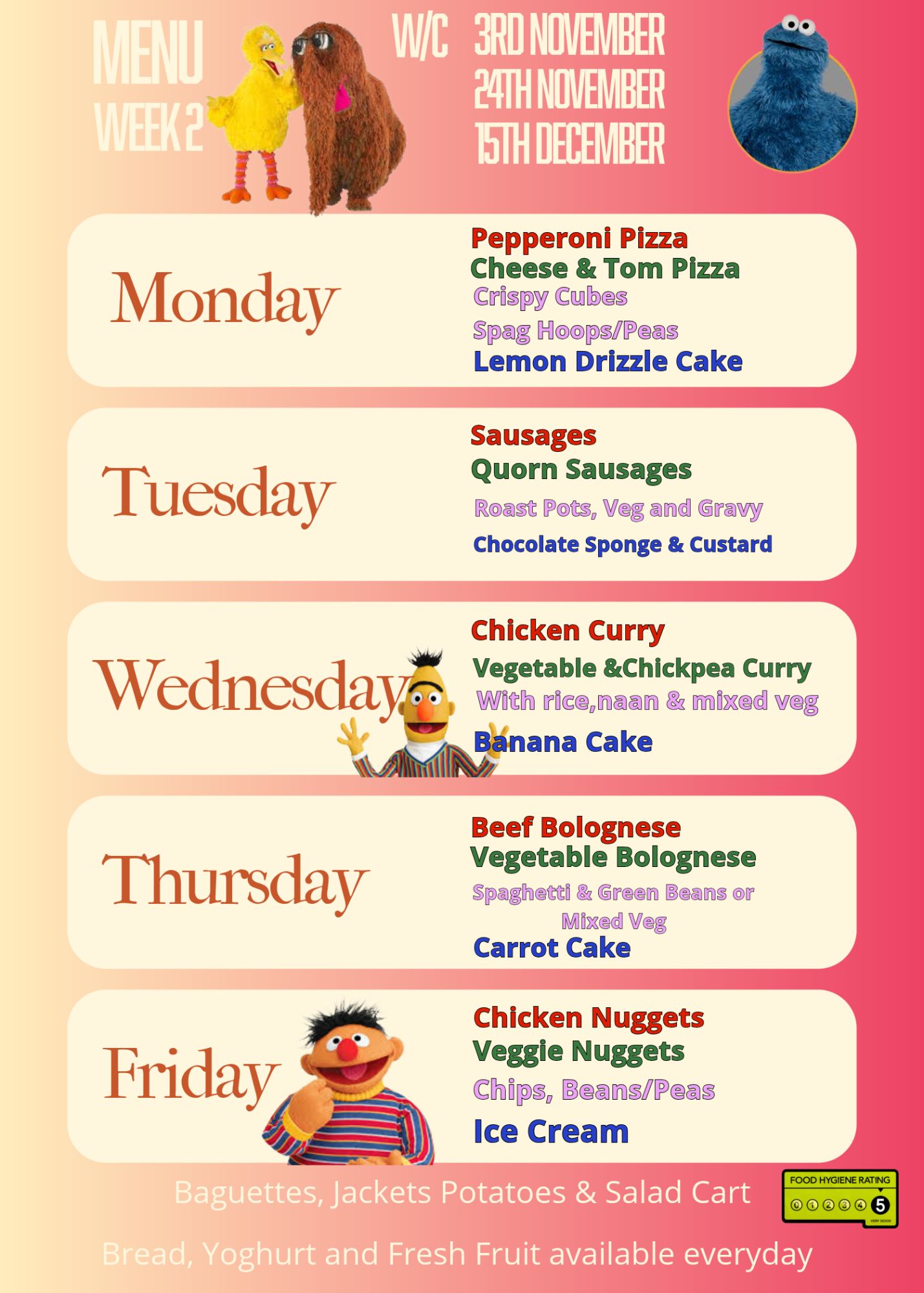 Meals can be paid for weekly or termly and currently cost £2.75 per day, £13.75 per week. KS2 have the option to purchase a school dessert with their home packed lunch at a cost of 50p- these can be ordered via the class teacher only.